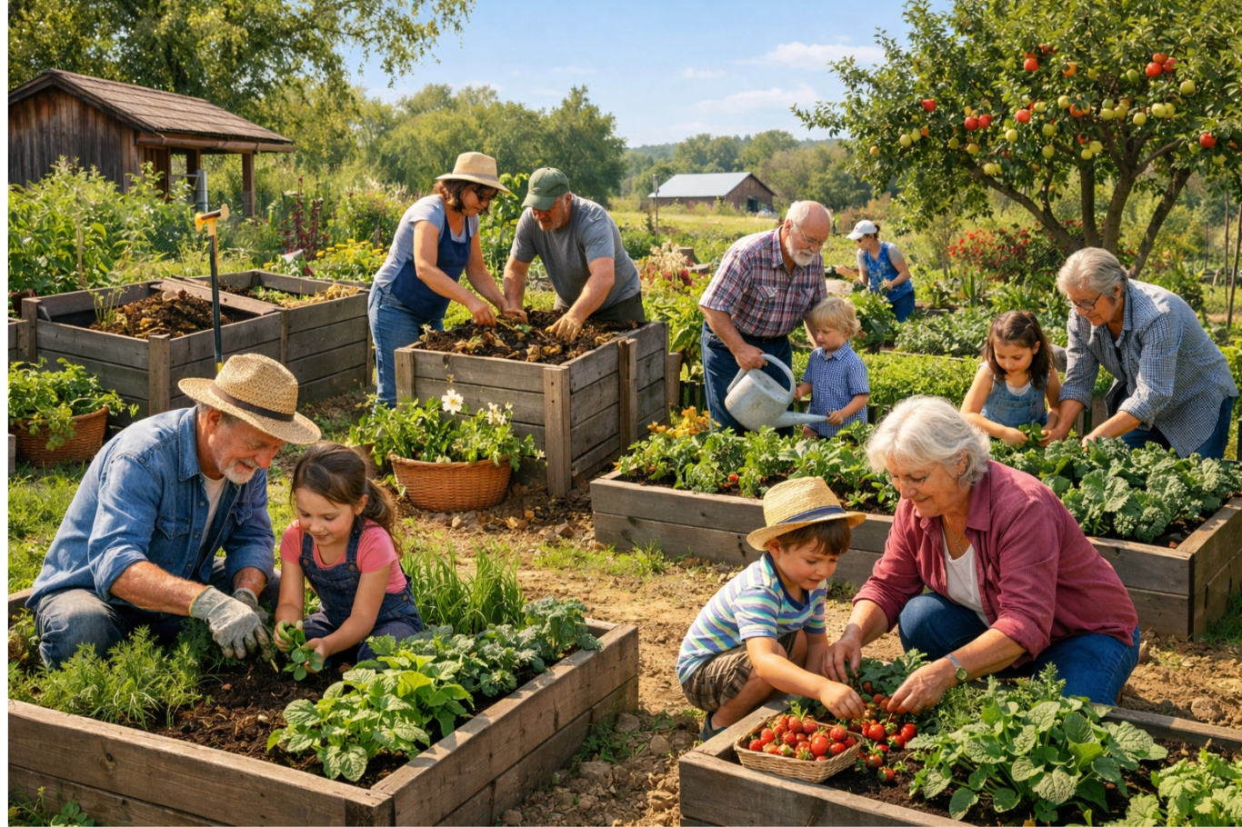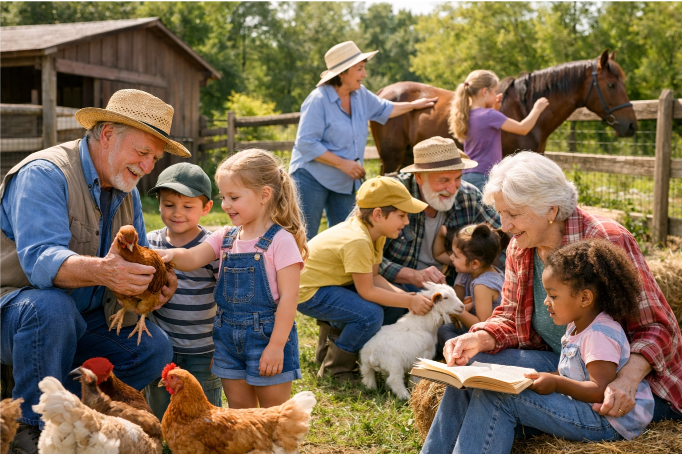 Kinder arbeiten zusammen mit Senioren und Tieren.