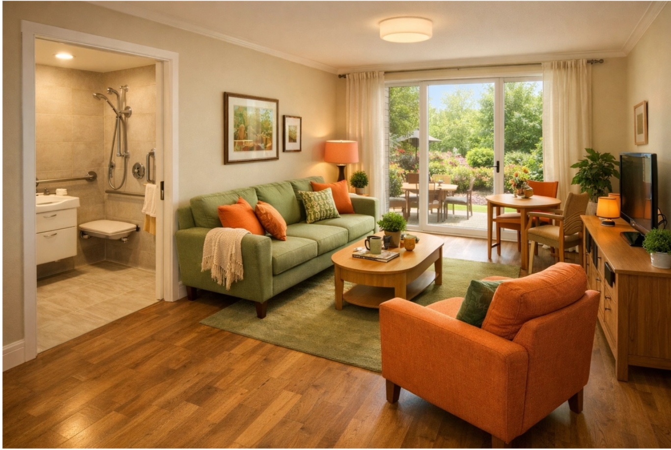 für rüstige Senioren. Selbstbestimmung, Privatsphäre und Zugang zu Gemeinschaftsräumen.